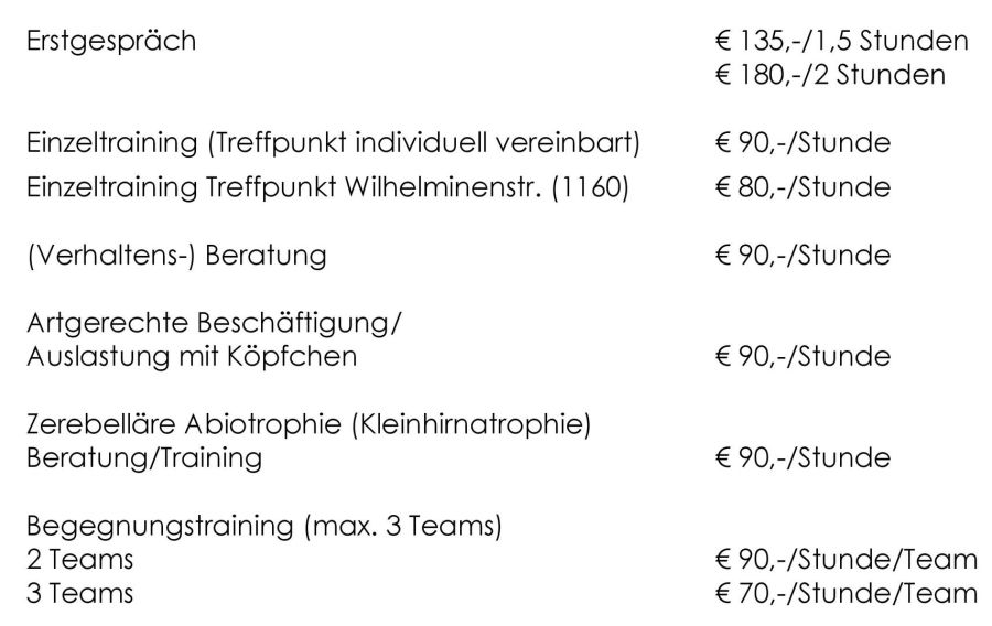 Fast allen Stunden voran steht ein ERSTGESPRÄCH (Dauer: regulär ca. 1,5 bis 2 Stunden/ oder individuell vereinbart nach Absprache) um das Mensch-Hund Team in gewohnter Umgebung kennenzulernen und um mir einen ersten Überblick von der Lebenssituation zu verschaffen.